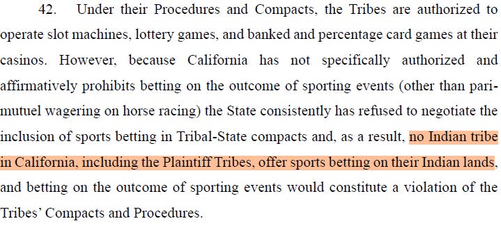 The Tribes’ allegations on how Kalshi’s contracts violate their compacts … could use more development. In fact, the Complaint alleges: “the State consistently has refused to negotiate the inclusion of sports betting in Tribal-State compacts and, as a result, no Indian tribe in California, including the Plaintiff Tribes, offer sports betting on their Indian lands.” Compl. ¶ 42. To be sure, the Tribes do allege that “Kalshi violates the Tribes’ Compacts,” Compl. ¶ 43, but the allegations don’t really say how.