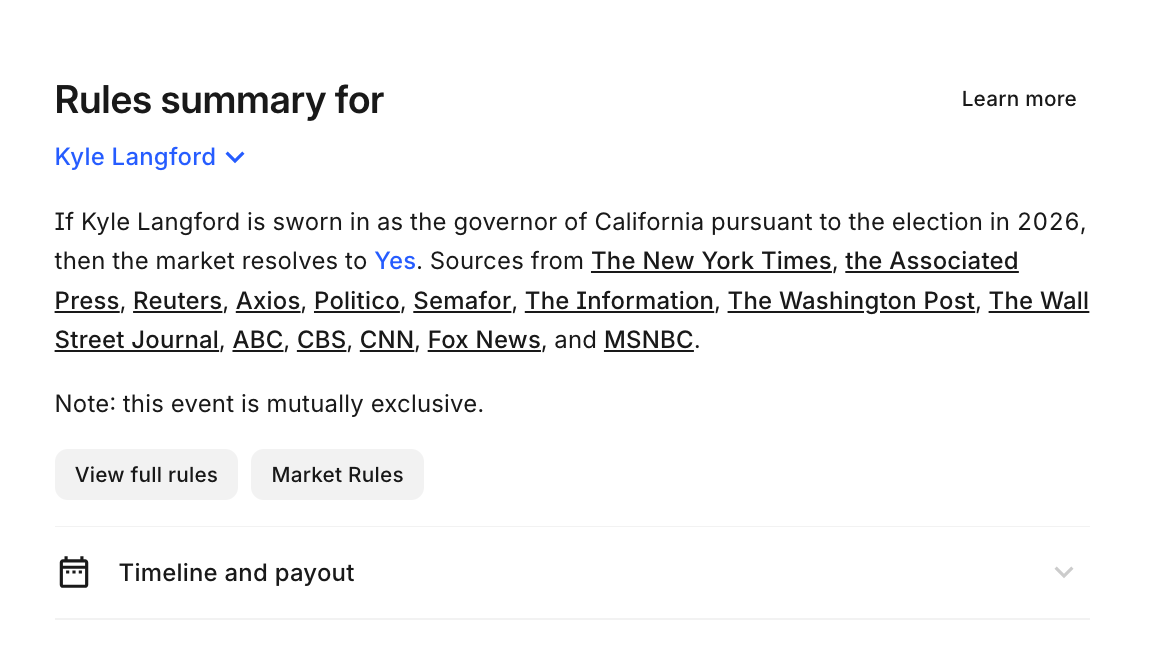 Also interestingly, those prohibitions don’t technically seem to ban candidates for office from trading on their own elections, unless they already hold office or are covered by any of the other bullet points. However, Langford was president of the California First PAC, and is still listed as such on his LinkedIn profile. Paid employees of PACs are prohibited from trading on most markets. But again, notably, this is not an explicit prohibition on the California governor market.