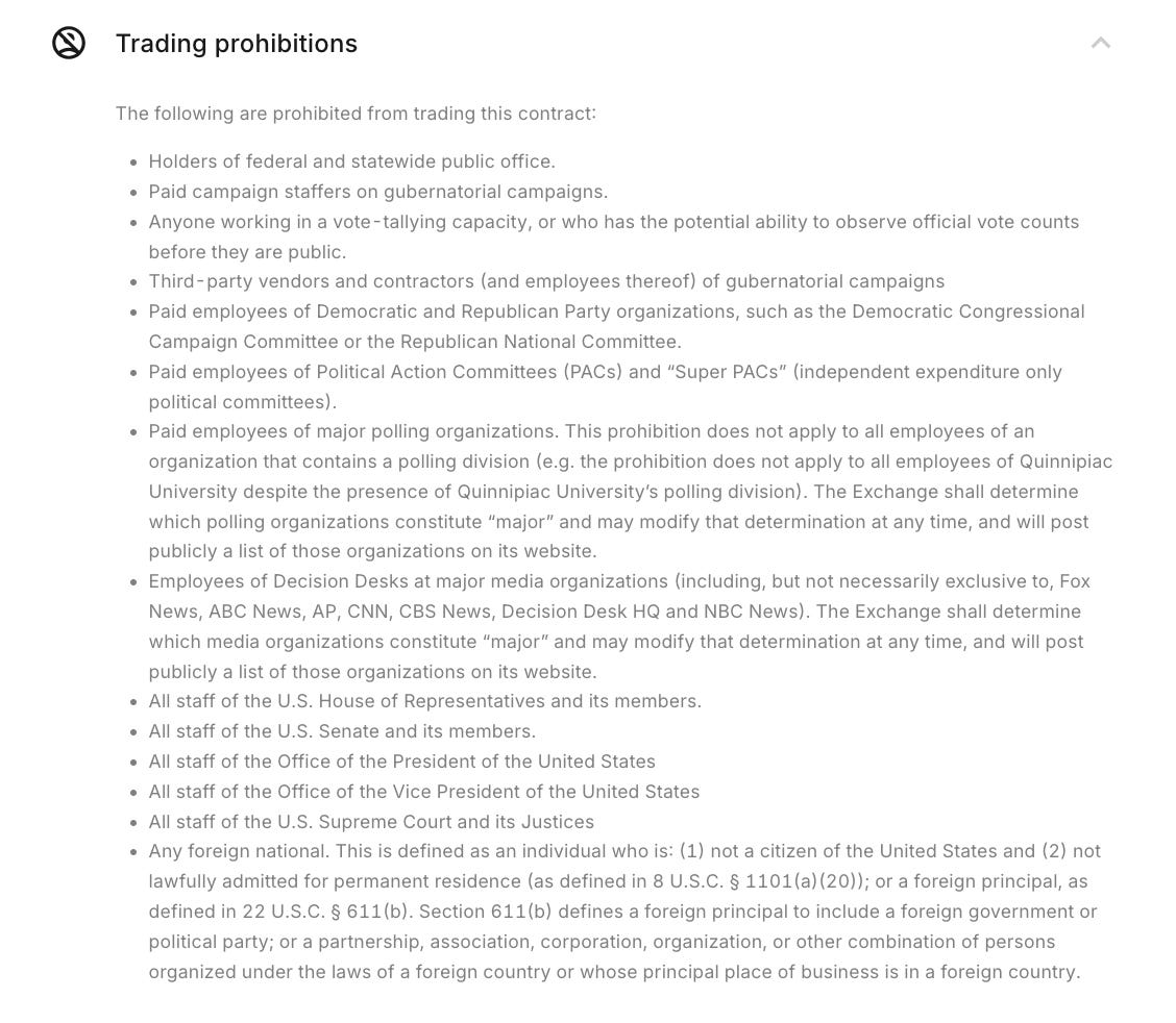 And the listed prohibitions on who can trade/bet on this (and most) election markets: