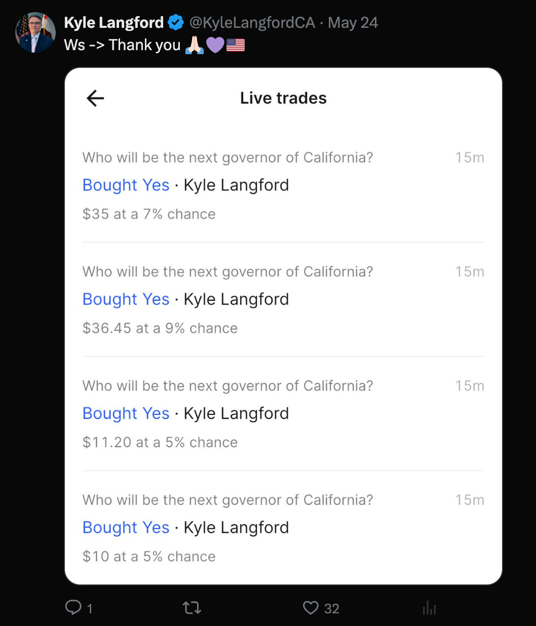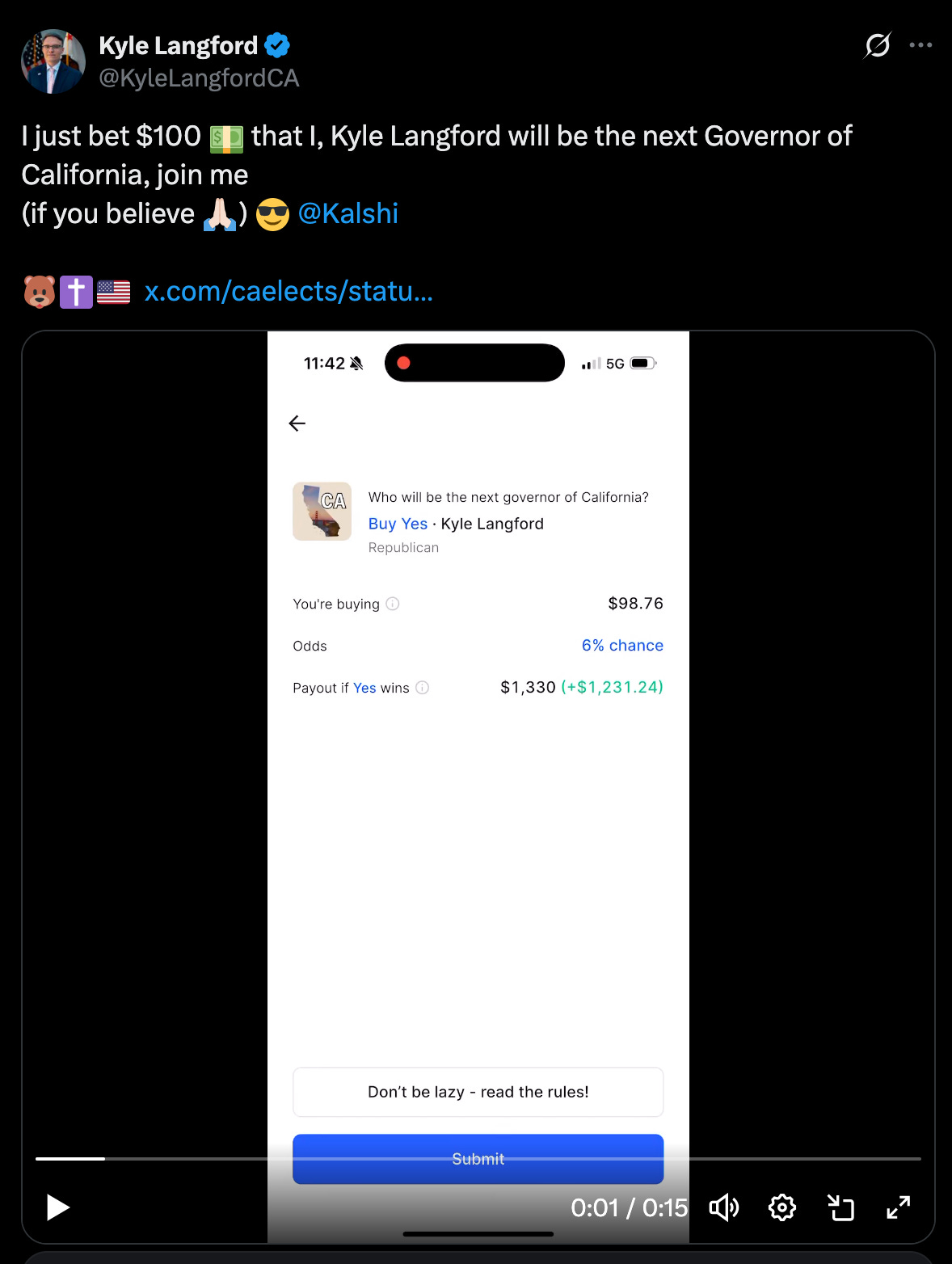 I just bet $100 that I, Kyle Langford will be the next Governor of California, join me (if you believe) @Kalshi