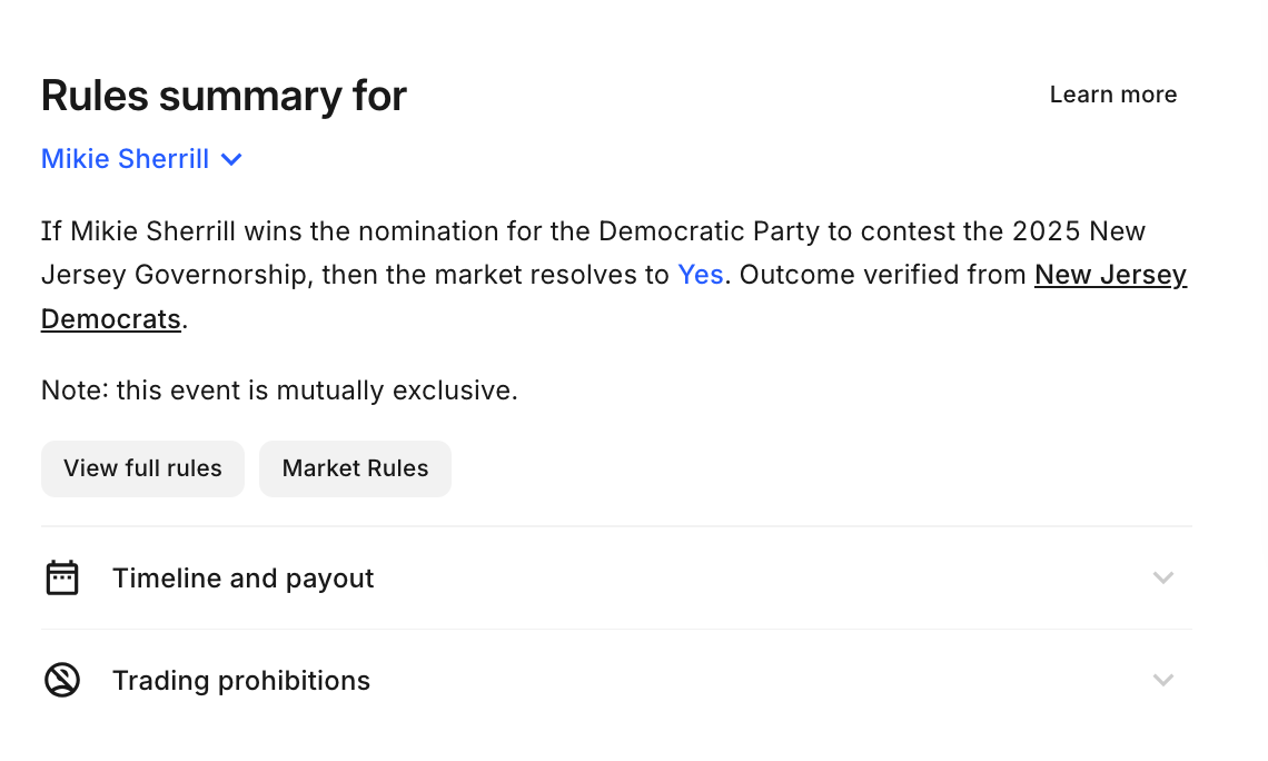 Usually, after the timeline and payout section, a political market would include a listing of the prohibitions. Not so in this case. But here’s what it looks like on a market for New Jersey governor: