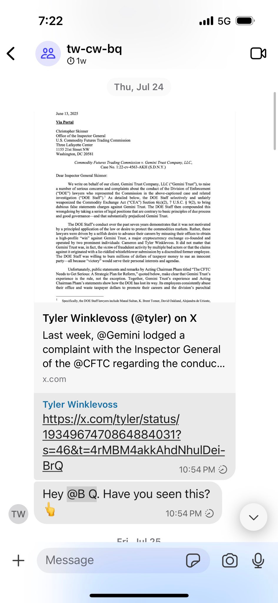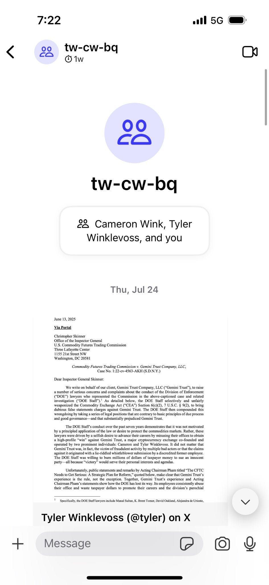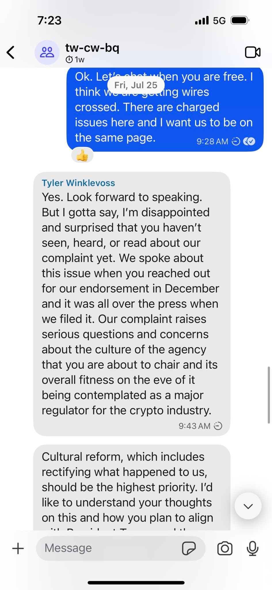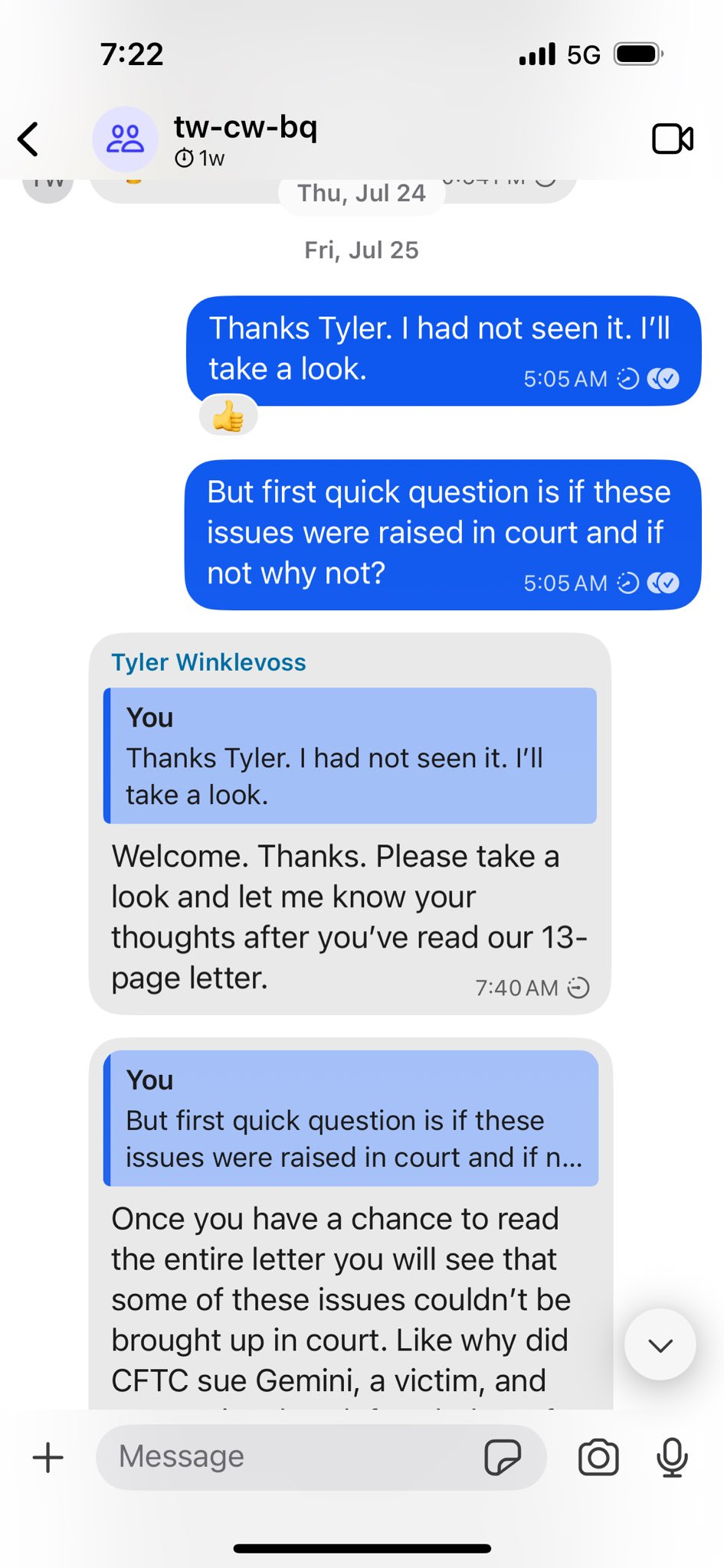 I’ve never been inclined to release private messages. But in light of my support for the President and belief that he might have been misled, I’ve posted here the messages that include the questions Tyler Winklevoss asked me pertaining to their prior litigation with the CFTC.