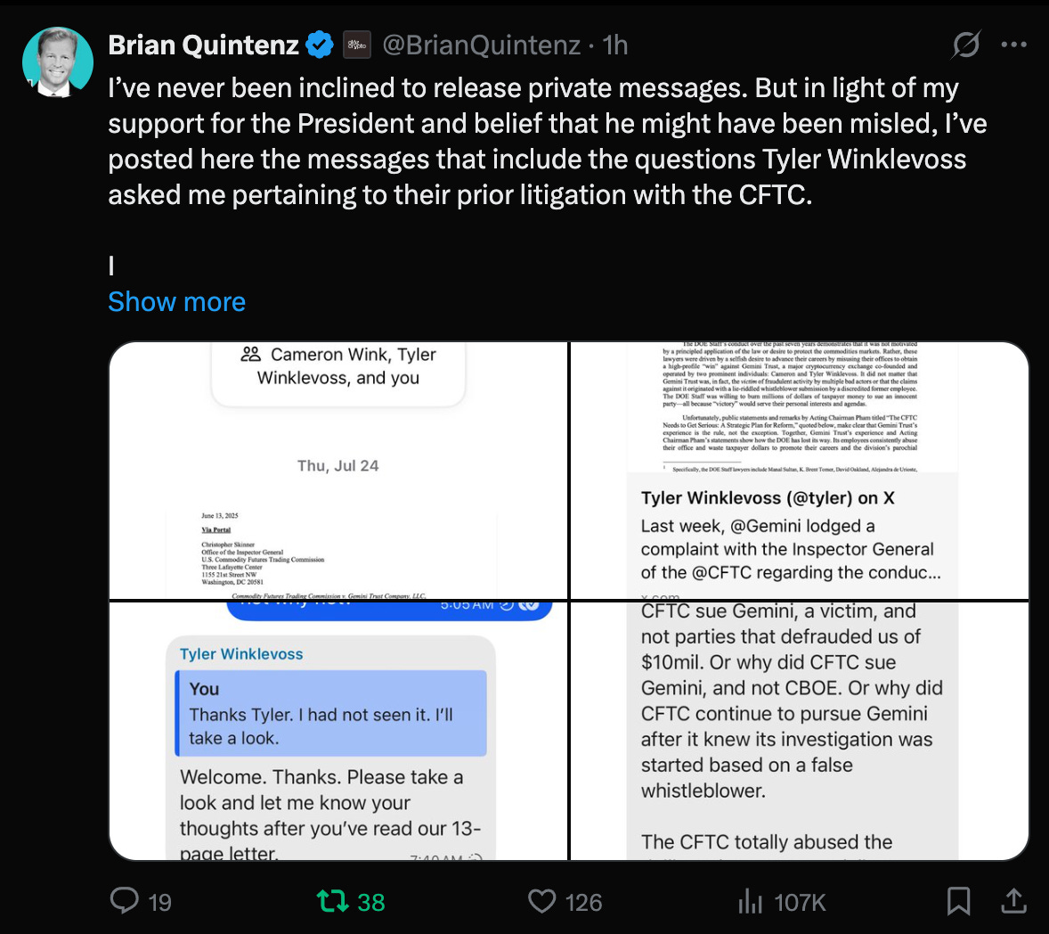 The messages Quintenz posted deal with the CFTC’s handling of Gemini. Gemini is on the cusp of its IPO.
