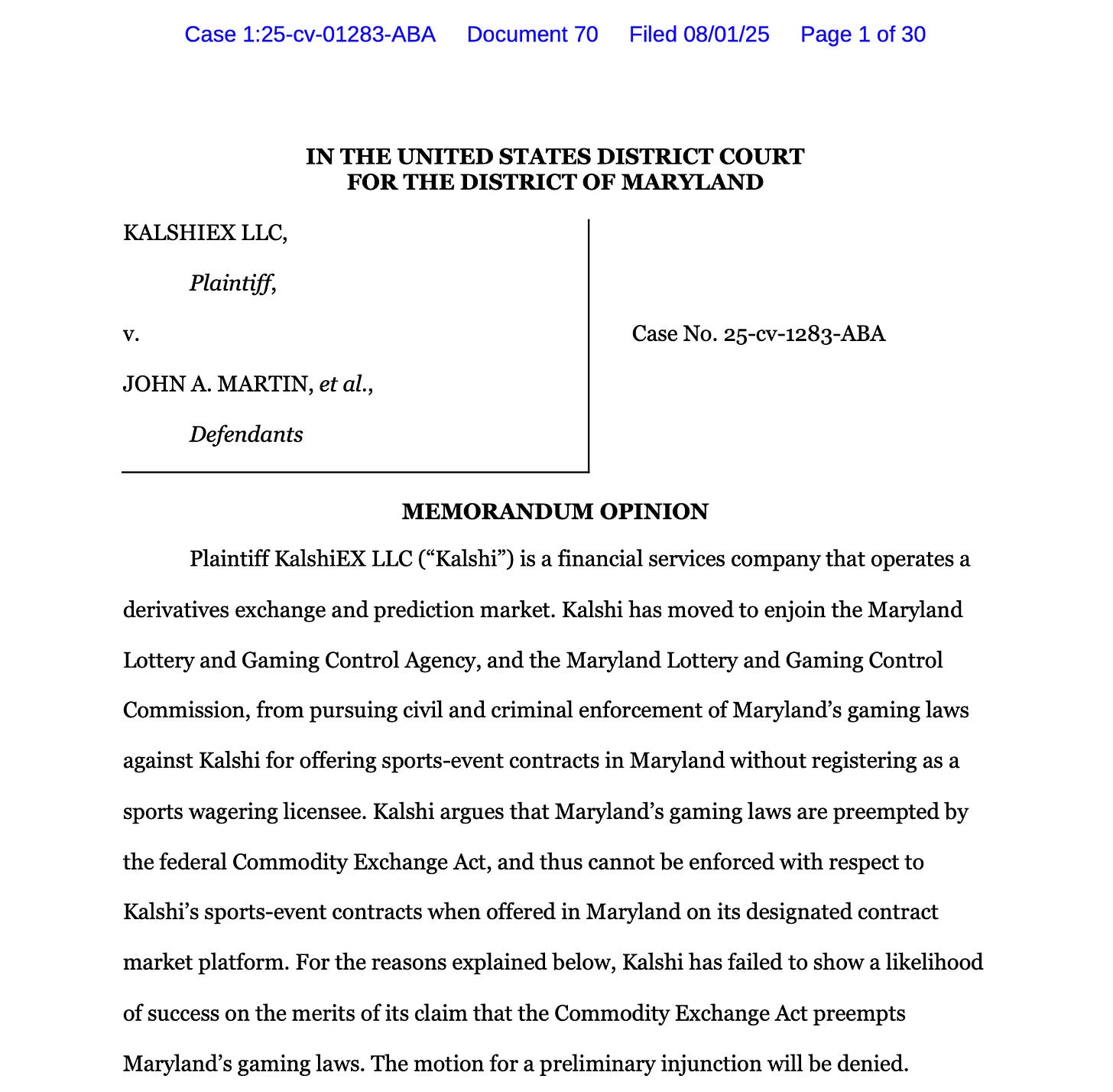 Federal court denies Kalshi's motion for a preliminary injunction in a case about whether Kalshi can offer sports betting in Maryland under federal law.