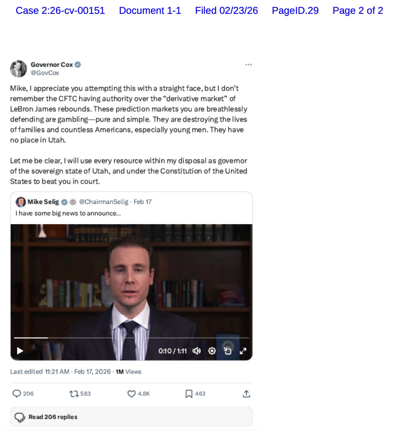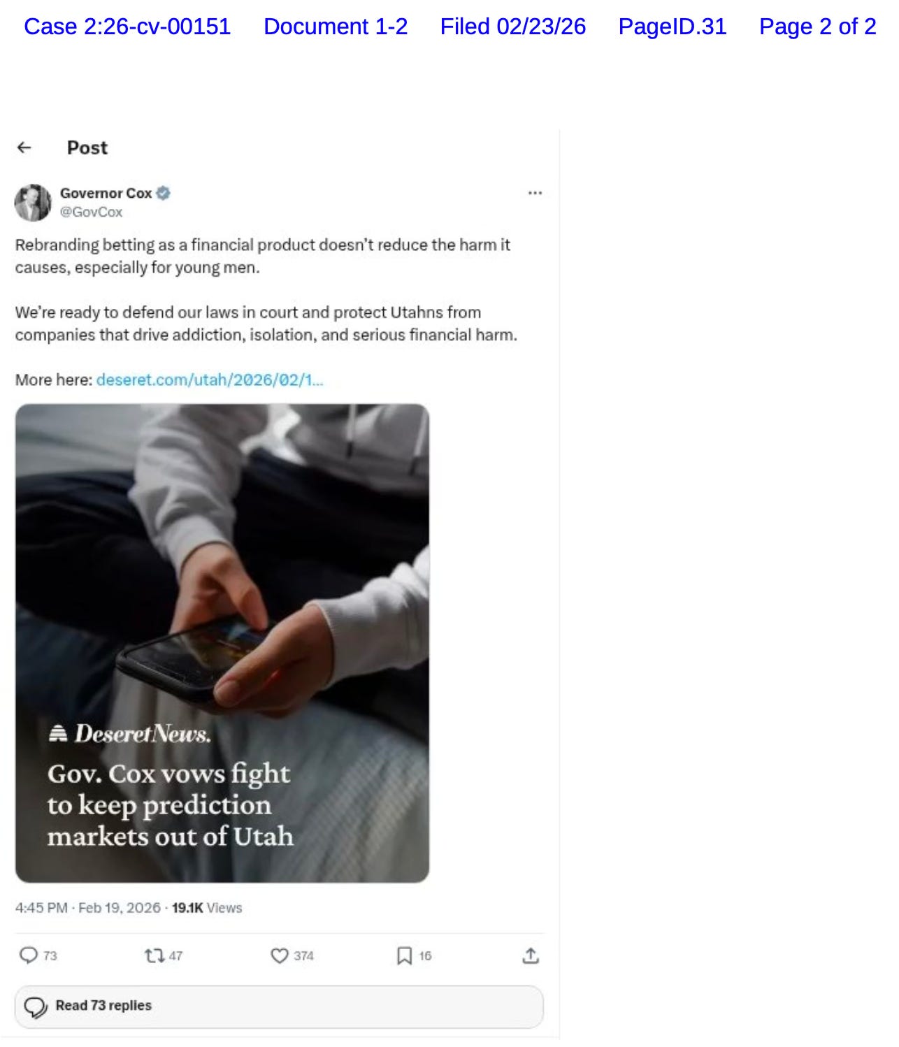 Prediction market seeks to stop Gov. Spencer Cox from enforcement action before it happens. Roundup: Bill to ban sports event contracts drops in Congress; Kalshi abandons affiliate badges on Twitter.