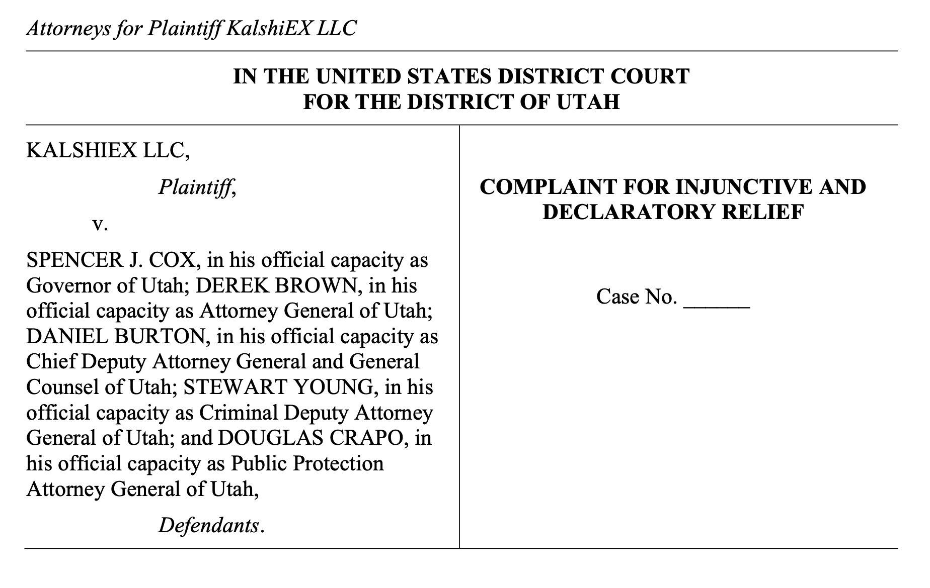 This action challenges the State of Utah’s intrusion into the federal government’s exclusive authority to regulate derivatives trading on exchanges overseen by the Commodity Futures Trading Commission (“CFTC”). 7 U.S.C. § 2(a)(1)(A). Plaintiff KalshiEX LLC (“Kalshi” or “Plaintiff”) believes the Governor of Utah (the “Governor”) and the Attorney General’s Office of Utah (the “Utah AG”) will imminently bring an enforcement action against Kalshi with the intent to prevent Kalshi from offering event contracts for trading on its federally regulated exchange. Defendants have repeatedly represented that they believe Kalshi is operating unlawfully under Utah anti-gambling laws—just last week the Governor said “I think you’re going to see 50 states suing these guys in one way or another” and that businesses like Kalshi are “illegal in Utah and will continue to be so.” Yesterday, Attorney General Brown published an op-ed, which referenced Kalshi by name, made clear that Attorney General Brown considers trading event contracts to be illegal in Utah, and stated he has a plan to address prediction markets operating in the state. And when Kalshi’s counsel made multiple attempts to contact the Utah AG to inquire as to whether Utah was preparing to take action against Kalshi, it was met with silence, even though the Utah AG had previously been willing to communicate with counsel.
