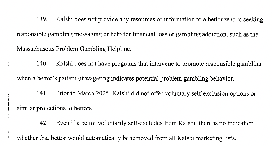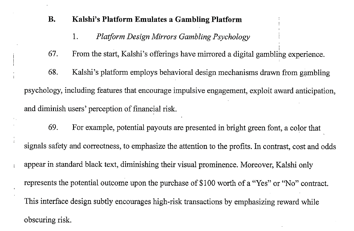 The complaint delves at length into how Kalshi acts like a gambling platform and that it is not meeting state standards for responsible gambling. Excerpts from the complaint: