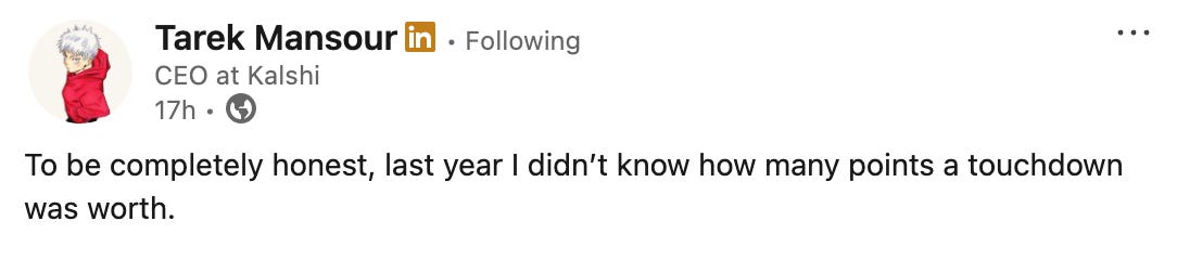 Sportsball: I am doubtful Kalshi is going to be the company that wins sports betting in the US long-term, until they start hiring people who know sports and betting on sports. Kalshi is a sports betting exchange being led and mainly populated people from other worlds. They seem to revel in the fact that they don’t know sports: