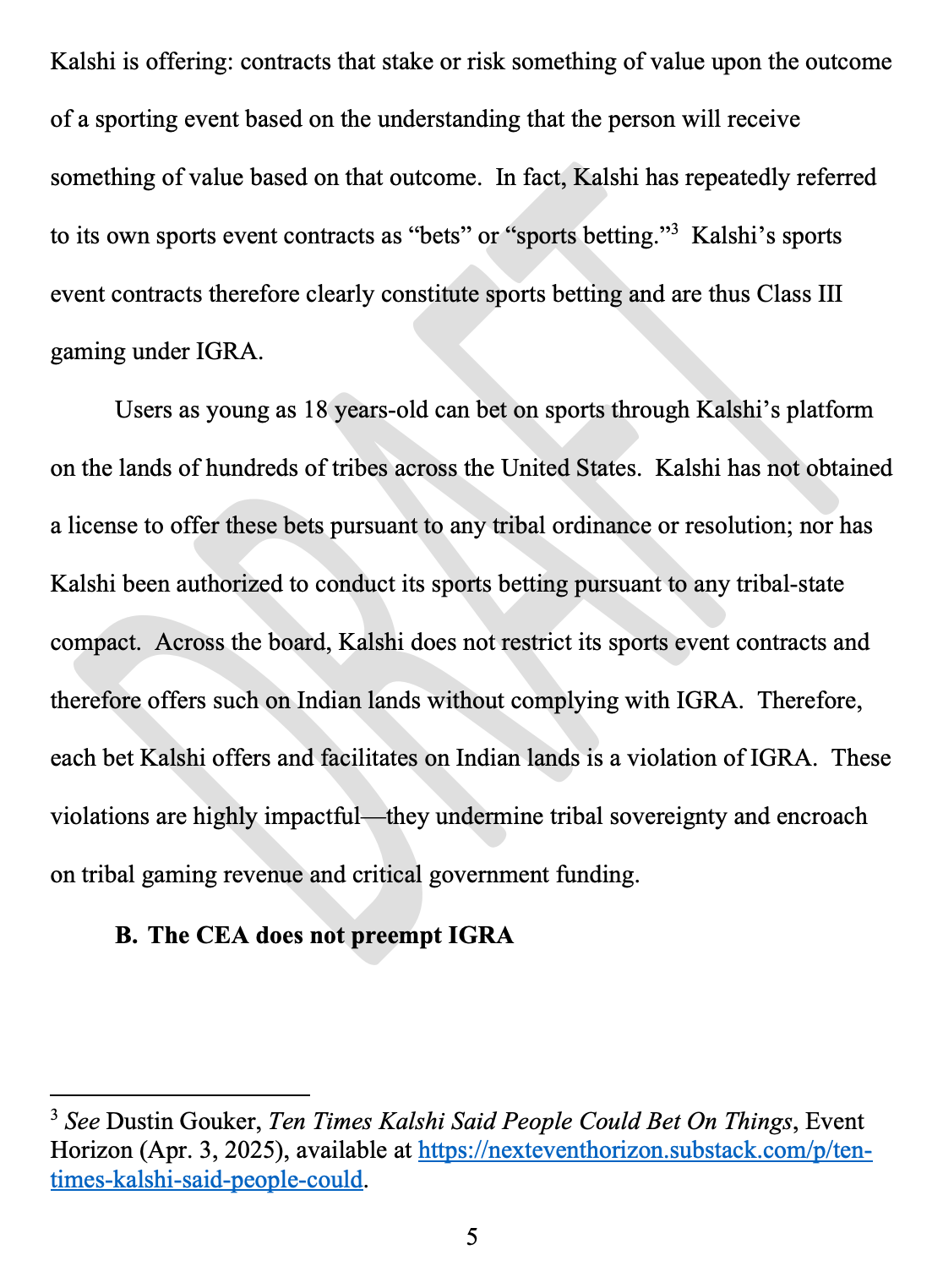 KalshiEX LLC’s (“Kalshi”) unlawful and unfair entrance into the gaming market has adversely impacted tribal gaming revenue and the benefit of tribes’ bargained-for compacts. Additionally, by offering its so-called sports event contracts under the guise of commodity trading pursuant to the Commodity Exchange Act (“CEA”), Kalshi impedes tribes’ inherent sovereign right to regulate gaming activity on Indian lands. Contrary to Kalshi’s arguments: (1) the CEA does not govern its gaming-related sports event contracts, (2) such contracts are expressly prohibited by the CEA and Commodity Futures Trading Commission’s (“CFTC”) own regulations, and (3) federal, state, and tribal gaming laws therefore apply to the contracts (including IGRA).