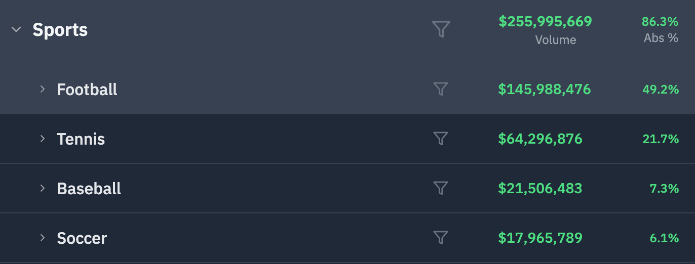 Beyond college football, the US Open in tennis was a major driver of volume, at almost 21% of all trading.