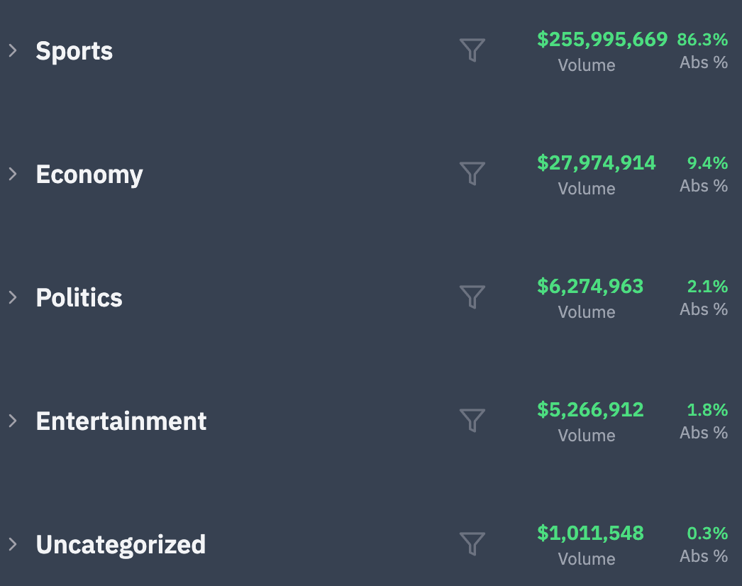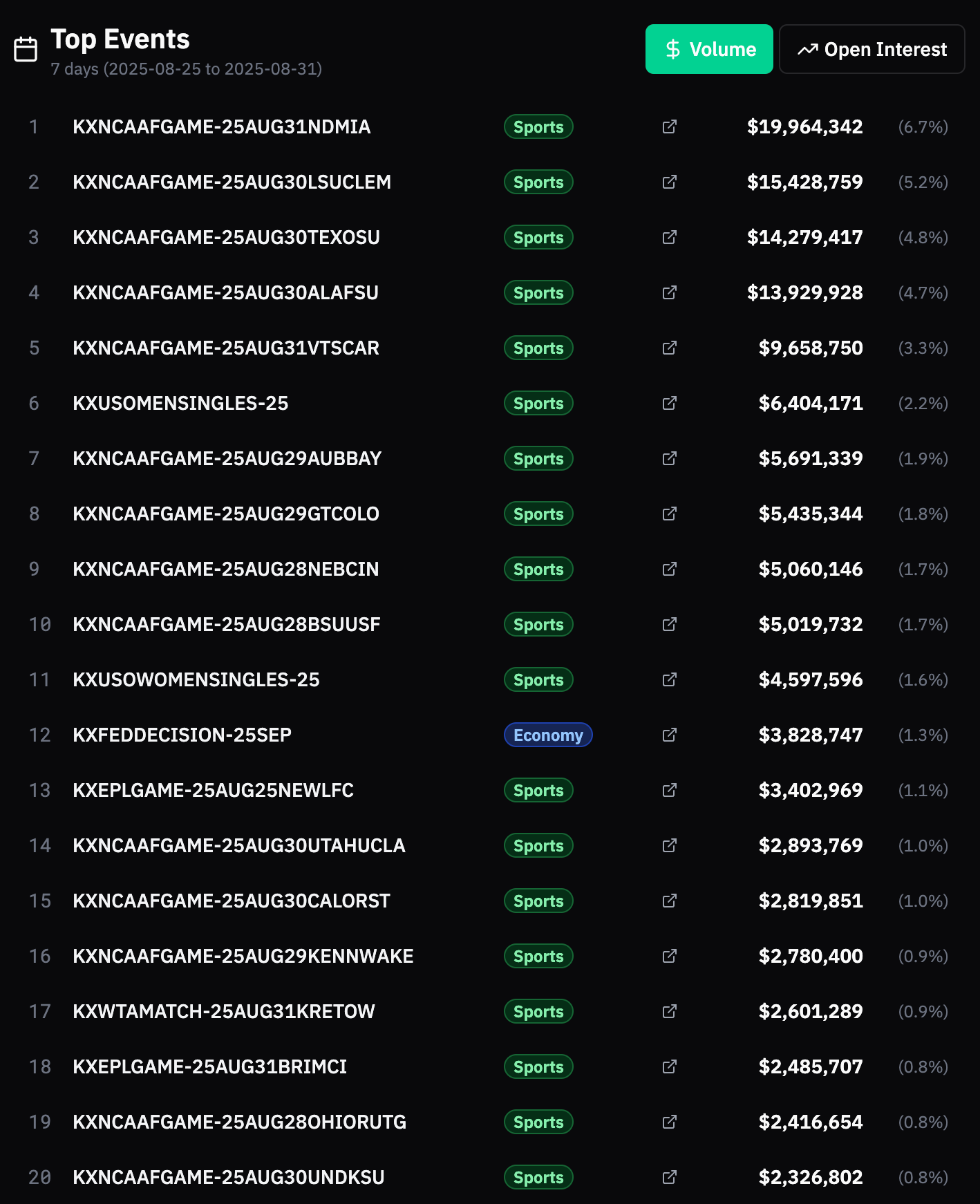 It was the biggest week since the November elections at Kalshi, which hit almost $300 million in trading volume for Aug. 25-31. Activity was dominated by sports, and football in particular. Eighty-six percent of all trading at Kalshi last week came on sporting events, and nearly 50% of all volume was football.